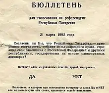 - ↑ Erlanger, Steven (22 March 1992). "Tatars Vote on a Referendum All Agree Is Confusing". The New York Times. ISSN 0362-4331. Retrieved 16 December 2021.