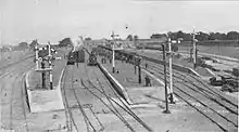 It lies on the outskirts of Epsom and is the closest station for Epsom Downs Racecourse, where the Derby is held and the British monarch traditionally alights from the British Royal Train in those years when attending the Derby. The line serving it was opened (as the Chipstead Valley Railway) in stages between 1897 and 1901, with the commissioning of the final section coinciding with the opening of the station on 4 June that year (by which time the SER had absorbed the independent company). The station closed in September 1914 and was used occasionally for race specials from 1920 until full public service restored (upon electrification) on 25 March 1928.[3] In its heyday, the station had seven platforms (to handle the sizeable amounts of racecourse traffic)[4] but today only three remain.
