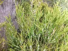 The shrub has an erect form and typically grows to a height of 3 to 4 metres (10 to 13 ft). It blooms between July and October producing white flowers.[2] It can be grown as an ornamental shrub in the garden where it is hardy and has dense foliage. The small white flowers grow in masses and the foliage is aromatic. The shrub is drought tolerant once established and will also tolerate light frosts.[1]
