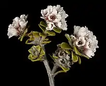 The shrub has a spindly, erect to spreading and procumbent form, typically growing to a height of 2 metres (7 ft).[1] The leaves are typically 3 to 7 millimetres (0.12 to 0.28 in) in length.[2] It blooms between September and October producing small white petal flowers[1] with a diameter of approximately 1 cm (0.39 in) that appear in dense cluster of about 20 flowers. Each flower contains about 10 stamens, one opposite each sepal and petal.[2]