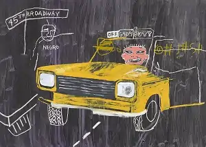 Taxi 45th/Broadway depicts a black man labeled "NEGRO" as he unsuccessfully attempts to hail a cab at 45th Street and Broadway. Meanwhile, a white taxi driver ignores him and curses profanities. This scenario was a reality for Basquiat.[4] Despite his meteoric rise from a downtown street artist to a sensation of the New York art scene, he still faced discrimination due to his race. "Being black and a kid and having dreadlocks, he couldn't even get a taxi," Haring said.[5]