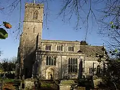 The Church of England parish church of Saint John the Evangelist has a Decorated Gothic north aisle and arcade dating from about 1360. The east window of the south aisle is also Decorated Gothic, but the present south arcade and the rest of the south aisle are Perpendicular Gothic work from the end of the 15th century. The clerestory of the nave was added at the same time. The bell tower also is Perpendicular Gothic. The chancel was rebuilt in 1865 to plans by the architect W.F. Poulton.[5] The church is a Grade II* listed building.[6] The tower has a ring of six bells.[7] Abraham I Rudhall of Gloucester[8] cast the fourth and fifth bells in 1717.[9] Thomas Bond of Burford[8] cast the treble, second, fifth and tenor bells in 1937.[9] St John's has also a Sanctus bell of unknown date.[9] The parish of St John the Evangelist is now part of the Benefice of Burford, Fulbrook, Taynton, Asthall, Swinbrook, and Widford.[10]