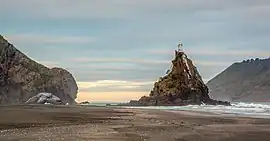 The island was referred to by various variations of the name Ninepin Rock by European settlers, including Ninepins Rock and The Nine Pins.[5] In the mid-19th century, Te Toka-Tapu-a-Kupe / Ninepin Rock was an island at high tide, however over time joined the mainland, due to the changing sand dunes of Whatipu.[6]