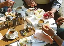 Britons also hold opinions as to the proper manner in which to drink tea when using a cup and saucer.[82] Historically, during the 1770s and 1780s, it was fashionable to drink tea from saucers. Saucers were deeper than is the current fashion, and therefore more similar to bowls like their Chinese antecedents.[83] If one is seated at a table, the proper manner to drink tea is to raise the teacup only, placing it back into the saucer in between sips. When standing or sitting in a chair without a table, one holds the tea saucer with the off-hand and the teacup in the dominant hand. When not in use, the teacup is placed back in the tea saucer and held in one's lap or at waist height. In either event, the teacup should never be held or waved in the air. Fingers should be curled inwards; despite popular belief in the United States, no finger should extend away from the handle of the cup.[73]