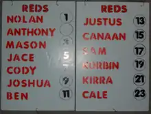 Tee-ball associations generally allow children between the ages of four and seven to play in their leagues.[1] A tee-ball coach sets the team lineup and fielding positions in the team's scorebook. The positions that get the most action in tee-ball are pitcher and first base, followed by the rest of the infield positions. In some leagues, catcher is also a special position due to the added gear that is worn; in other leagues, there is no catcher. In tee-ball, the pitcher is usually used for defensive purposes only, though gently pitched balls may be used with older or more advanced players in place of the fixed tee. The ball is placed on an adjustable tee atop the home plate at a suitable height for the batter to strike. (In some clubs, adult coaches give the batter an opportunity to try and hit a few pitched balls before going to the tee in the hope that this will further develop batting skills.)[2] Most of the other rules are similar or identical to those of baseball, though the game is played on a smaller field, typically one used for Little League or other youth baseball.[2] In addition, for the youngest tee-ball players, runs and outs are often not recorded, and every player gets to bat each inning.[1]