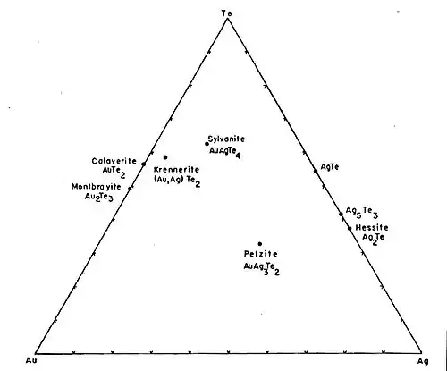 - ↑ Cabri, L.J., 1964, Phase Relations in the Au-Ag-Te System, McGill University PhD Thesis