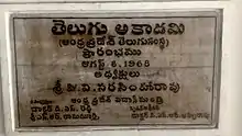 A committee led by J. P. L. Gwynn was formed by the Andhra Pradesh government to "modernize" Telugu and make it the primary medium for administration and education in 1966 in light of the central government's decision to promote regional languages in the same fields. Based on the committee's recommendation and the central government's scheme, the state government created the Telugu Academy as a government institute for promoting Telugu in 1968.[1] P. V. Narasimha Rao started chairing the Academy the same year, possibly being the inaugural holder of the role.[2][3]
