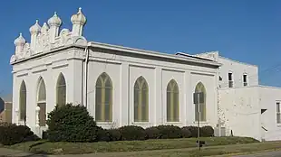 Built in 1877,[2]: 138 the Moorish Revival façade of the modest building features a Gothic Revival-arched door flanked by a pair of Gothic-arched windows punctuated by four pilasters. These are surmounted with molded capitals and fanciful embellishments and the whole is topped by a whimsical row of four, small, onion domed turrets.[3][4]