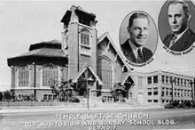 The church was first known as the Fourteenth Avenue Baptist Church when it opened in 1917 by the Fourteenth Avenue Baptist Society, founded in 1892. In 1921 the Fourteenth Avenue Baptist Society merged with the Grand River Avenue Baptist Church; the combined church became Temple Baptist Church. The congregation consisted mostly of white southerners who had moved to Detroit seeking employment. In 1934 Temple Baptist Church invited leading fundamentalist Rev. J. Frank Norris to serve as pastor. J. Frank Norris simultaneously pastored his home church, First Baptist Church of Fort Worth Texas, flying himself between Fort Worth and Detroit.[2] In 1950, after internal feuding, George Beauchamp Vick became pastor and remained so after the church moved to new location on Grand River Avenue. In 1968, the third Temple Baptist Church opened in Redford Township, at 23800 West Chicago (now Detroit World Outreach). After the death of G. Beauchamp Vick, Temple Baptist was pastored by A.V. Henderson and then by Truman Dollar until his death by suicide in the 1980s. Brad Powell was then called in as pastor in 1990 and the church changed its name to Northridge Church after it was relocated to Plymouth Michigan.