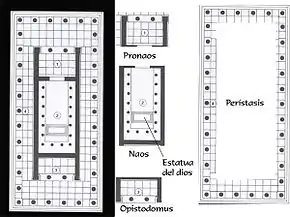 The Athenaio was a peripteral temple with six columns on the short sides and fourteen on the long sides. On the front, the intercolumniation at either edge was reduced, the canonical solution to issues of perspective. In total, the building was 22 metres wide and 55 metres long. The peristyle surrounded a cella with a pronaos and an opisthodomos, both featuring two columns in antis.