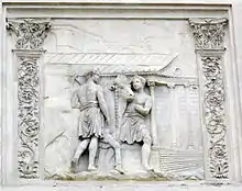The temple pediment is shown on the Ara Pietatis relief, which represents Magna Mater in aniconic mode; her empty throne and crown are flanked by two figures of Attis reclining on tympanons; and by two lions who eat from bowls, as if tamed by the goddess' unseen presence.[7]