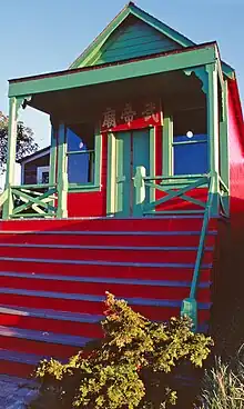 The Temple of Kwan Tai is a small brightly painted red and green redwood building with two doors, three windows, and a gable roof,[2][3] located at 45160 Albion St in Mendocino, facing south toward the Pacific Ocean.[4] Nine steps lead from the street level to the front door, a number that "is said to fend off evil spirits".[5] The name of the temple is written over the door,[6] in Chinese characters pronounced in Cantonese as "Mo Dai Miu" or "Military God-king Temple". The main room of the temple is approximately 264 square feet (24.5 m2) in area;[3] a small room at the rear of the building, originally the temple keeper's quarters, is now used as an office.[3][4]