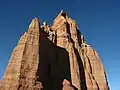 Temple of the Moon is a 5,665-foot (1,727-meter) elevation summit located in Capitol Reef National Park, in Wayne County of Utah, United States.[2] This remote, iconic monolith is situated 12 mi (19 km) north-northeast of the park's visitor center, and 0.37 mi (0.60 km) south of Temple of the Sun, in the Middle Desert of the park's North (Cathedral Valley) District. Cathedral Valley was so named in 1945 by Charles Kelly, first superintendent of Capitol Reef National Monument, because the valley's sandstone monoliths reminded early explorers of ornate, Gothic cathedrals, with fluted walls, alcoves, and pinnacles.[4] The free-standing Temple of the Moon towers nearly 300 feet (91 meters) above its surrounding terrain, which is within the Fremont River drainage basin. John C. Frémont's 1853 expedition passed through Cathedral Valley.[5]