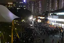 On 1 April 2016, with no cinemas screening the film despite high demand, Ten Years was simultaneously screened at 34 different public locations around Hong Kong, including the underside of motorway flyovers (in Sham Shui Po and Mei Foo), the public steps leading to the Sha Tin Town Hall, and the forecourt of the Legislative Council Complex.[13] The screenings were organised by a variety of community groups, educational institutions, and churches.[13][14] They were attended by thousands, many of whom were frustrated to have been unable to get tickets before the film was pulled from cinemas.[15][16]