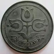 The zinc 10-cent coin was minted in the Netherlands between 1941 and 1943 during World War II. It was worth 1/10, or .10, of the guilder, and designed by Nico de Haas, a Dutch national-socialist. The respective mintage was of 29,800,000 (1941), 95,600,000 (1942), 29,000,000 (1943).[1]
