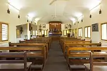 The dismantled church was railed to Birdum and then trucked the remaining distance.[5] The trucks carrying the dismantled church were caught in floods at Daly Waters and parts of the loads were left on the roadside. Spread out along the route for some time, it became known as the "longest church in Australia". While the church was reconstructed, mass was held "in the residence of some local Catholic".[6] The relocation was expensive, and by the time it was opened on 21 November 1937 by Bishop Raible[7][8][9][lower-alpha 2] had cost "many hundreds of pounds". The church was reconstructed in a different layout that in its original location.[1] An office and verandahs were later built "on two sides to serve as accommodation for the priest".[10]