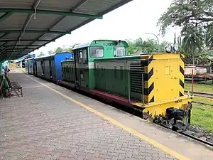Like most areas in the West Coast Division; the area around Tenom in the Interior Division is used by the North Borneo administration for agricultural purposes. To transport the produce to major towns, English engineer Arthur J. West import labourers from China to construct a railway line in 1903 in Tenom;[1][2] which was later completed in 1905.[3][4] The original station was built from wood and located in (5°7′25″N 115°56′43″E / 5.12361°N 115.94528°E) before it was moved to the present site in 2007 with the construction of a new station following the modernisation of rail services in the modern state of Sabah. From 1970s, the line to Melalap that connecting to the station have been dismantled.[3][5] The present station began its operation on 21 February 2011. In 2016, new diesel multiple unit (DMUs) from India for use in the Beaufort–Tenom lines was introduced.[6]