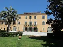 When contracted by Maria Luisa in the late 1810s, Nottolini designed a large landscaping project which covered the pine forest area known as Pineta di Levante, stretching for some 4 km along the sea coast from Viareggio to the border between the duchies of Lucca and Tuscany.[54] Its axis was to be a large avenue parallel to the coastline, with perpendicular paths and specific areas designed for different types of vegetation.[55] Some sources state that the centre of the estate was to be a hunting cottage,[56] but others refer to a grandiose residential design, a palace intended to impress.[57] Carlo Ludovico asked Nottolini to scale down the project. Eventually the residence was to consist of 3 separate buildings; the central one was intended as residenza signorile, to be flanked by 2 other buildings supposed to accommodate servants and as stables, magazines, workshops, a forge, a carriage house and similar. In the 1840s the central edifice was enlarged with side wings, which connected all 3 buildings.