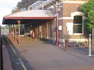 Terang opened as the terminus of the line from Camperdown. On 4 February 1890, the line was extended to Warrnambool.[1][2] During the first year of operation, the station sold 11,510 tickets to Camperdown, for a total revenue of £11,157.[3] At the peak of operations, the station had a four road yard. Today, it has a single dead end siding.[2]