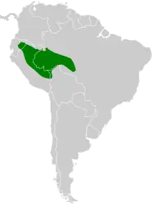 The chestnut-shouldered antwren is found from eastern Ecuador and eastern Peru south of the Rio Napo south into northwestern Bolivia and east in Brazil through northern Rondônia and into Amazonas state as far as the Rio Madeira. It inhabits the subcanopy and canopy of terra firme and drier floodplain tropical evergreen forest.[5][6][7]