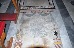 (Translated as "To God, the Best and Greatest. For Robert Sherley, most noble Englishman, Count Palatine, Knight of the Golden Spur, Emperor Rudolph II's envoy to Shah Abbas, the King of Persia, (and) the representative of the same King to the Popes of Rome, to Emperors, to the Kings of Spain, England, Poland, Muscovy, and the Mogul Empire, distinguished ambassador to other European princes. Theresia Sampsonia, native of the land of the Amazons, daughter of Samphuffus, prince of Circassia, set up [this monument] for her most beloved husband and for herself, as a resting place for his bones—brought to Rome from Persia for dutiful devotion's sake—and for her own, aged seventy-nine. 1668.")[81][lower-alpha 12]