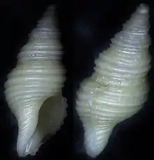 Shell up to 12 mm high, fusiform with acute spire and body whorl occupying about 60% of the total height. Protoconch small, with 4 convex whorls and a sculpture of oblique threads forming a delicate reticulate pattern. Teleoconch with a sculpture of regular, high spiral cords; there are three cords on the first teleoconch whorl and the number increases by intercalation of additional cords in the later whorls. Interspaces of cord filled wit delicate raised lines, parallel to growth lines. Body whorl markedly constricted around the siphonal canal. Aperture lanceolate, with outer lip simple and fragile, curved in lateral view and forming a very deep notch immediately beneath the suture. Protoconch dark brown, teleoconch beige, sometimes with darker suubsutural blotches or flames.[2]