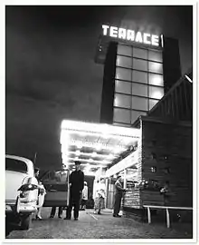 Built at an estimated cost of $750,000,[14] the Terrace was the first major movie theater to open in the Minneapolis suburbs after World War II, and it was one of the country's first ultra-modern theaters.[15] Visitors from far and wide came to see the new "movie palace," billed as "America's Finest Theatre." A 1952 guest register showed signatures from 25,000 people from all 48 states and travelers from across the world.[14]