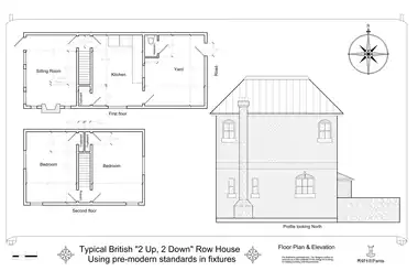 For a typical two-up two-down house, the front room has historically been the parlour, or reception room, where guests would be entertained, while the rear would act as a living room and private area.[4] Many terraced houses are extended by a back projection, which may or may not be the same height as the main build. A terraced house has windows at both the front and the back of the house; if a house connects directly to a property at the rear, it is a back to back house.[1] 19th century terraced houses, especially those designed for working-class families, did not typically have a bathroom or toilet with a modern drainage system; instead these would have a privy using ash to deodorise human waste.[5]