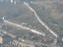 The terraced house reached mass popularity in the mid-19th century as a result of increased migration to urban areas. Between 1841 and 1851, towns in England grew over 25% in size, at which point over half the population lived in urban areas; this increased further to nearly 80% by 1911. Terraced houses became an economical solution to fit large numbers of people into a relatively constricted area.[14] Many terraced houses were built in the South Wales Valleys in the mid to late 19th century owing to the large-scale expansion of coal mining there. In the Rhondda, the population increased from 4,000 in 1861 to 163,000 in 1891. Because of the imposing local geography, containing narrow river valleys surrounded by mountains, terraced houses were the most economic means of providing sufficient accommodation for workers and their families.[15]