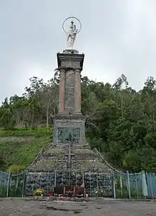 The Our Lady of Peace sanctuary (Portuguese: Nossa Senhora da Paz) statue which is supported by 4 Roman columns, is located here. It was built after the attacks on Madeira during world war 1, which were first felt in Madeira on December 3, 1916, when the German U-boat, U-38, captained by Max Valentiner went into the Port of Funchal in Madeira and torpedoed and sank 3 ships, CS Dacia (1,856 tons),[1] SS Kanguroo (2,493 tons)[2] and Surprise (680 tons).[3] The commander of the French Gunboat Surprise and 34 of her crew (7 Portuguese) died in the attack. The Dacia, a British cable laying vessel,[4] had previously undertaken war work off the coast of Casablanca and Dakar, was in the process of diverting the South American cable into Brest, France. Following the attack on the ships, the Germans proceeded to bombard Funchal for two hours from a range of about 2 miles (3 km). Batteries on Madeira returned fire and eventually forced the Germans to withdraw.[5]