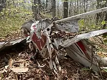 On March 19, 1968, a Beechcroft G18S crashed into Terrible Mountain, killing all 7 people on board, 2 pilots and 5 passengers.[3] The passengers were executives from the Jones and Lamson Company based in Springfield, VT[4] and were flying on a private flight from Bridgeport, CT to Springfield, VT.[5] The pilot had knowingly attempted to fly through foggy conditions with faulty instrumentation.[3] The wreckage of the plane was never cleared, and still sits on top of the mountain. There is a small plastic plaque dedicated to one of the passengers who died, Burton B. Burks.[6]