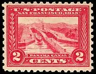 The Panama Canal is represented by the Pedro Miguel Locks in the Panama–Pacific Exposition issue. An estimated 500 million of these 2-cent stamps were printed and issued to the public in a first release in 1913 with perforations 12, and a second in 1914 in perforations 10.[16]