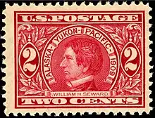 The Alaska–Yukon–Pacific Exposition commemorated the nation's northwest territory on the 10th anniversary of the 1897 Klondike Gold rush and the 40th anniversary of the 1867 Alaska Purchase. Delayed from 1907 to 1909 to avoid competing with the Jamestown Exposition. Secretary of State William H. Seward is shown. He negotiated the $8 million purchase of Alaska from Russia. The popular press in 1867 referred to the purchase as "Seward's Folly," but by 1909 the importance of this acquisition was recognized.[12]