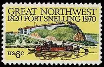 Fort Snelling, Minnesota was commemorated on its 150th anniversary with a 6-cent stamp on October 17, 1970. The fort was instrumental in opening the Northwest.[40]