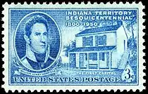 The 3-cent Indiana Territory sesquicentennial commemorative postage stamp was issued on July 4, 1950. It features a portrait of William Henry Harrison, the first governor of Indiana Territory and later the 9th President of the US. Indiana's first Capitol building is pictured to the right.[35]