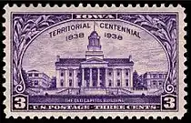 Iowa Territory was commemorated on August 24, 1938, with a 3-cent stamp. It came from earlier parts of the Missouri, Michigan, and Wisconsin territories. The Iowa Territory included later Iowa, parts of Minnesota, and the Dakotas. Iowa achieved statehood in 1846. The Old Capitol in Iowa City, the territorial capital is shown.[39]