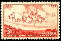 Kansas Territory was commemorated on its 100th anniversary with a 3-cent stamp on May 31, 1954. The foreground depicts a field of wheat with a set of farm buildings. A wagon train of pioneers in light silhouette looms above. The stamp was issued in sheets of fifty, with 110,000,000 stamps authorized.[37]