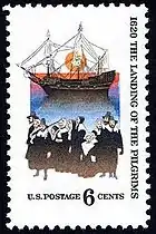 Pilgrims landing and settlement at Plymouth, Massachusetts was commemorated with a 6-cent stamp marking on the 350th anniversary, November 21, 1970.[21]
