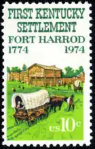 Kentucky's first settlement 200th anniversary was commemorated with a 10-cent stamp on June 15, 1974. Fort Harrod was the first permanent settlement founded by James Harrod. The scene depicts two settler's wagons approaching the fort.[33]