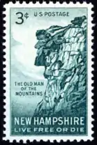 New Hampshire's founding was commemorated by a 3-cent stamp issued on June 21, 1955, celebrating the 150th anniversary of European discovery of "The Old Man of the Mountains" rock formation. The landmark setting is taken from Franconia Notch, NH, with the state motto, "Live Free or Die" below.[32]