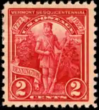 Vermont celebrated its 1777 independence as the Vermont Republic with a 2-cent stamp on August 3, 1927. Not one of the original thirteen states, it became the fourteenth. The vignette depicts a Green Mountain Boy from the Battle of Bennington dressed in buckskin with a rifle.[31]