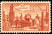 The Oregon Territory dispute was settled by the Oregon Treaty between the U.S. and Great Britain in 1846 under President Polk. The Oregon Territory was commemorated on its 100th anniversary with a 3-cent stamp on July 14, 1936. It comprised the present states of Oregon, Washington, Idaho, and parts of Montana and Wyoming. The stamp features a map of the Territory, including a trace of the Oregon Trail, flanked by a Native American scene and a covered wagon train.[10] A 3-cent commemorative of the 100th anniversary of the Gadsden Purchase issued December 30, 1953. The U.S. bought the Gadsden Purchase (1854) from Mexico. It amounted to 29,670 square miles which later became parts of Arizona and New Mexico.[11] With the Gadsden Purchase, the contiguous territory which would become the "lower forty-eight" contiguous states of the United States was complete.