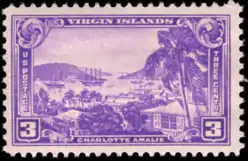 The third stamp honored Puerto Rico featuring 'La Fortaleza', the Spanish Governor's Palace. Puerto Rico was ceded by Spain in an 1898 treaty ending the Spanish American War. Though some thought the stamp was limited to Puerto Rico, it was valid throughout the U.S. and its territories. The final stamp was in honor of the U. S. Virgin Islands, which was purchased from Denmark in 1917. The stamp displays a view of Charlotte Amalie, capital city of the territory.[14]
