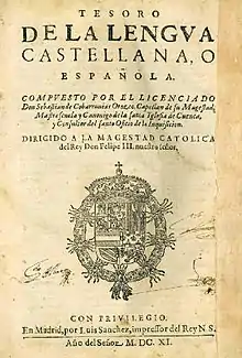 The Tesoro de la lengua castellana o española (Thesaurus of Castilian or Spanish Language) is a dictionary of the Spanish language, written by Sebastián de Covarrubias in 1611.