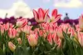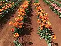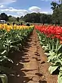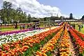 TheTesselaar Tulip Festival is held in Silvan, Victoria every spring, displaying more than 120 varieties of tulips are shown on a 55-acre farm.[1][2] This tulip farm was initiated by a couple of Dutch immigrants, Cees and Johanna Tesselaar. They arrived in Melbourne in 1939 and started to grow tulips, gladioli and daffodils on their land. After purchasing more land in Silvan, they grew more tulip bulbs, which attracted people to stop by on their property and admire their fields. In 1954, the Tesselaars open the farm to the public, with a coin donation for the Australian Red Cross. In 2017, around 900,000 tulip bulbs were planted using modern machinery, and 80,000 bulbs are still planted traditionally by hand.[3][4] The tulip festival has evolved to include music, food and wine festival to attract more visitors during the spring season (September - October).[5]