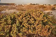 Tetraena qatarensis grows in arid conditions and is both drought and salt tolerant. In the Persian Gulf area the summer is very hot, any ground moisture present evaporates and the soil becomes increasingly salty. Under these conditions, the leaves dry up and fall off the plant, and it can survive in a leafless state for several years. When significant rain falls in winter, the soil becomes less salty and the plant is stimulated into new growth.[2] The leaf structure and physiology also change with the season, with unifoliate xeromorphic leaves better able to withstand water loss being present during the summer.[6] The seeds have tough coats and germination only occurs after significant rainfall.[2] The plants are found growing in association with several species of soil microfungi, regularly with Cladosporium sphaerospermum, but also sometimes with Penicillium citrinum and Aspergillus fumigatus.[7]