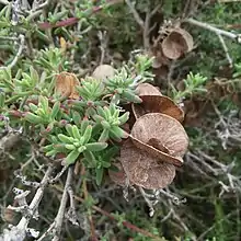 Tetragonia fruticosa, or kinkelbossie, is an endemic Southern African coastal perennial shrub or scrambler, well-suited to dune sand stabilisation and often browsed by livestock and game. It is found from sea-level to about 1100 metres.[1]