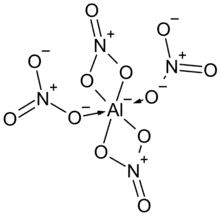 The tetranitratoaluminate group has two bidentate nitrate groups attached in a square around the aluminium, and with two other monodentate nitrates attached via one oxygen only, perpendicular, up and down from the square.[4]