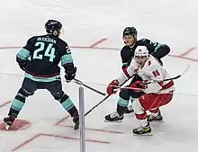Teuvo Henri Matias Teräväinen (born 11 September 1994) is a Finnish professional ice hockey forward for the Carolina Hurricanes of the National Hockey League (NHL). Nicknamed "Turbo", he was selected in the first round, 18th overall, of the 2012 NHL Entry Draft by the Chicago Blackhawks after playing several seasons with the Jokerit organization in Finland.[1] Also being drafted by the Kontinental Hockey League (KHL)'s Lokomotiv Yaroslavl in the 2011 KHL Junior Draft,[2] he is known for his offensive abilities and play-making skills.[3] In 2015, Teräväinen won a Stanley Cup as a member of the Blackhawks.