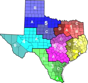 The Texas Highway Patrol is divided into seven regions and nineteen districts.[3] Historically, these regions were numbered I-VII, but were assigned geographic nomenclature in 2018 in order to facilitate easier identification by the public.[4]